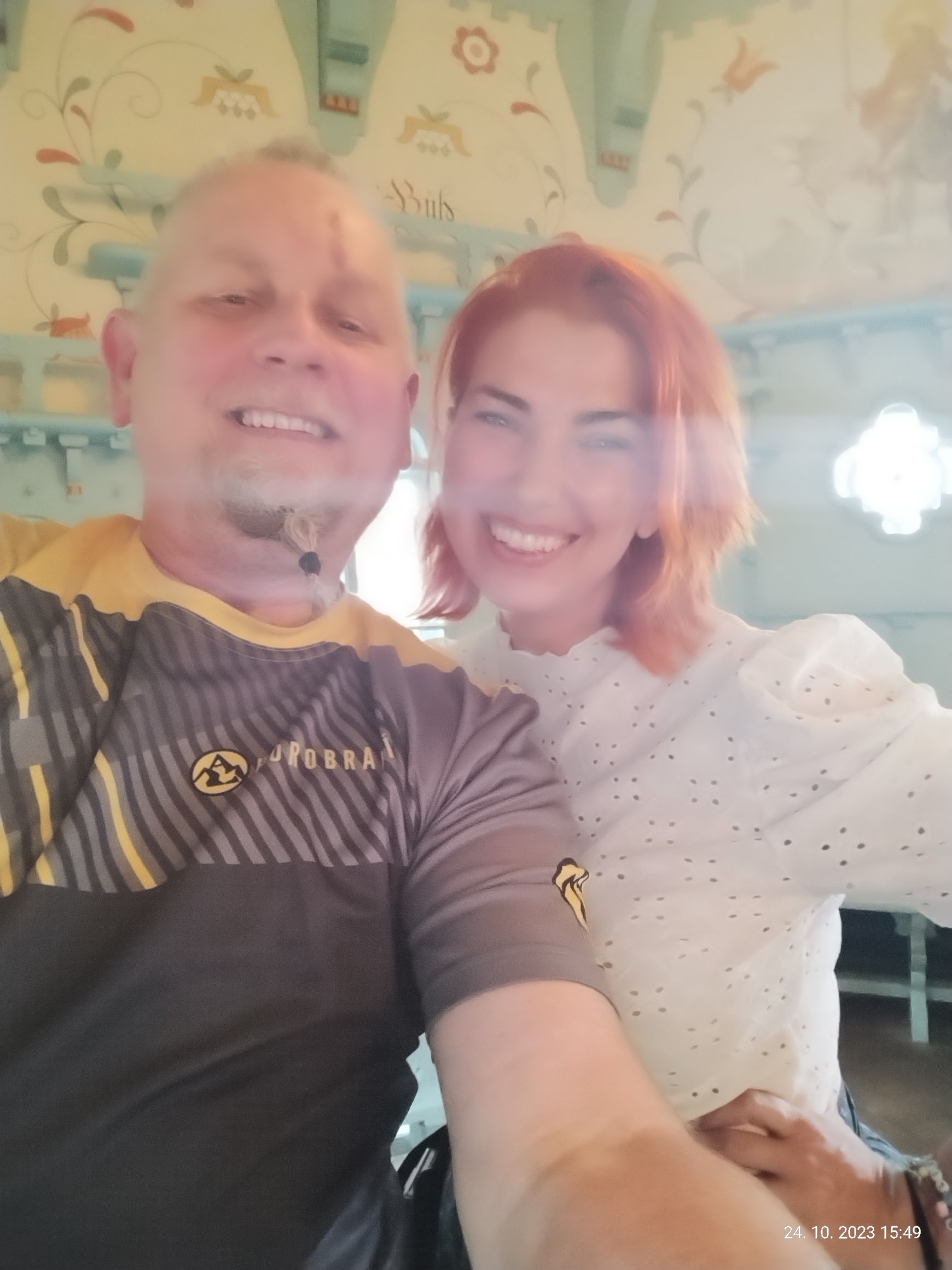 Nic tak nie pocieszy Górozbieracza, oczywiście poza zdobytym szczytem😉, jak spotkanie z kolejnym podobnie zakręconym, a tu w dodatku w roli kelnerki, która zauważywszy moją koszulkę zagadała: - "Oo! Horobraní?" Pod koniec (o 15:49) zamieniliśmy zaledwie kilka słów i nawet selfie na pamiątkę zrobiliśmy😊. Ponieważ później "spotkaliśmy się w fb grupie więc wiem, że nie ma też nic przeciwko publikacji tego zdjęcia🙂. | Nic tak nepotěší Horobraníka, samozřejmě kromě zdoláného vrcholu😉, než setkání s dalším podobně naladěným člověkem, a tady v roli číšničky, která si všimla mého trička a zeptala se: - "Oo! Horobraní?" Skoro na závěr (v 15:49) jsme prohodili jen pár slov a ještě jsme si udělali selfie na památku😊. Protože jsme se později potkali ve fb skupině, takže vím, že ji nevadí zveřejnění téhle fotky🙂. |